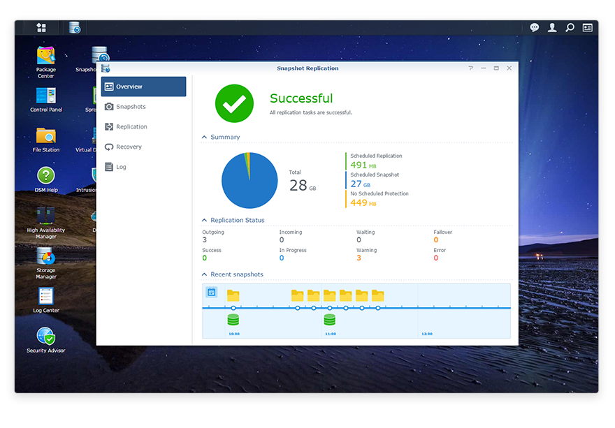 Synology DS916+ 可作為一個(gè)集中化的備份目的地。無論你是 Windows 或 Mac 使用者,你都可以使用 Cloud Station Backup 直接將電腦中的文件備份到你的 Synology NAS,任何時(shí)候做的修改都會(huì)自動(dòng)備份到 DS916+。Mac 使用者也可享受熟悉的 Apple® Time Machine 備份經(jīng)驗(yàn) 。你也可以將 DS916+ 上的數(shù)據(jù)備份到另一臺(tái) DiskStation、其它 rsync 兼容服務(wù)器、外接設(shè)備,甚至是 Amazon® S3、Glacier cloud service、Microsoft Azure、SFR 和 hicloud 等公有云服務(wù)。Synology Hyper Backup 讓你可運(yùn)行備份任務(wù)排程,以及將服務(wù)器回復(fù)到過去特定的時(shí)間點(diǎn)。同時(shí),不同版本間只備份經(jīng)過修改的數(shù)據(jù),以降低消耗的存儲(chǔ)空間和處理時(shí)間。
