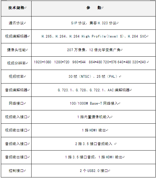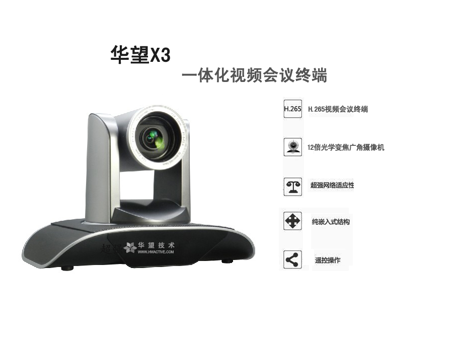 產品特性:內置高清視頻會議終端+12倍光學變焦廣角攝像機,安裝部署更簡單;業(yè)界首推H.265編解碼,降低40%帶寬占用;1080P高清分辨率;支持遙控器操作